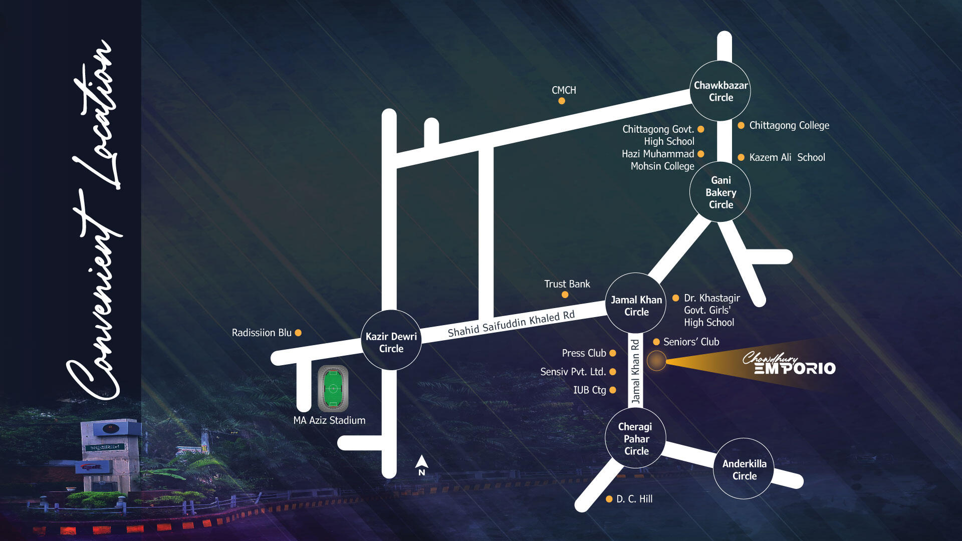 Chowdhury Emporio is strategically located at 56 AB, Jamal Khan road, Jamal khan, the healthy ward of Chattogram City Corporation. The location has been chosen keeping the vicinity in mind. Wide roads with well crafted beautification, presence of highly reputed schools, colleges, lifestyle and health facilities made the location vary attractive.