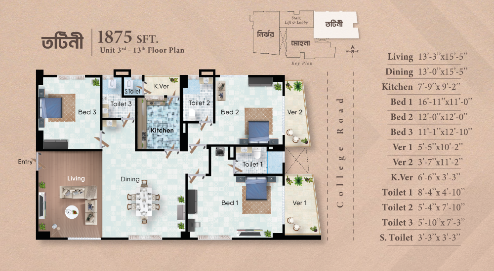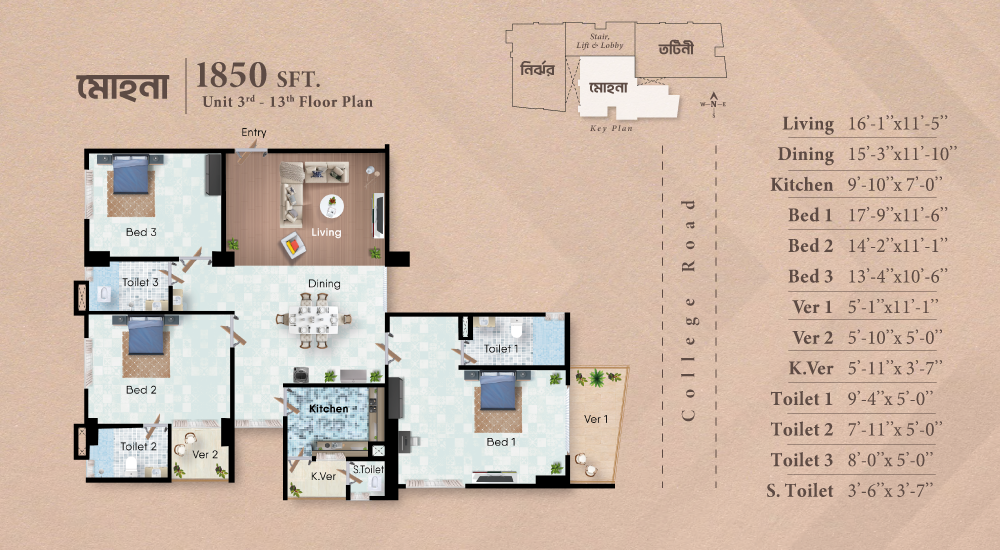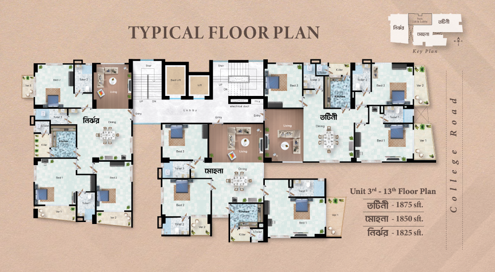 Jheenuk is strategically located at 139/A, College Road, Joynagar, the healthy ward of Chattogram City Corporation. The location has been chosen keeping the vicinity in mind. Wide roads with well crafted beautification, presence of highly reputed schools, colleges, lifestyle and health facilities made the location vary attractive.